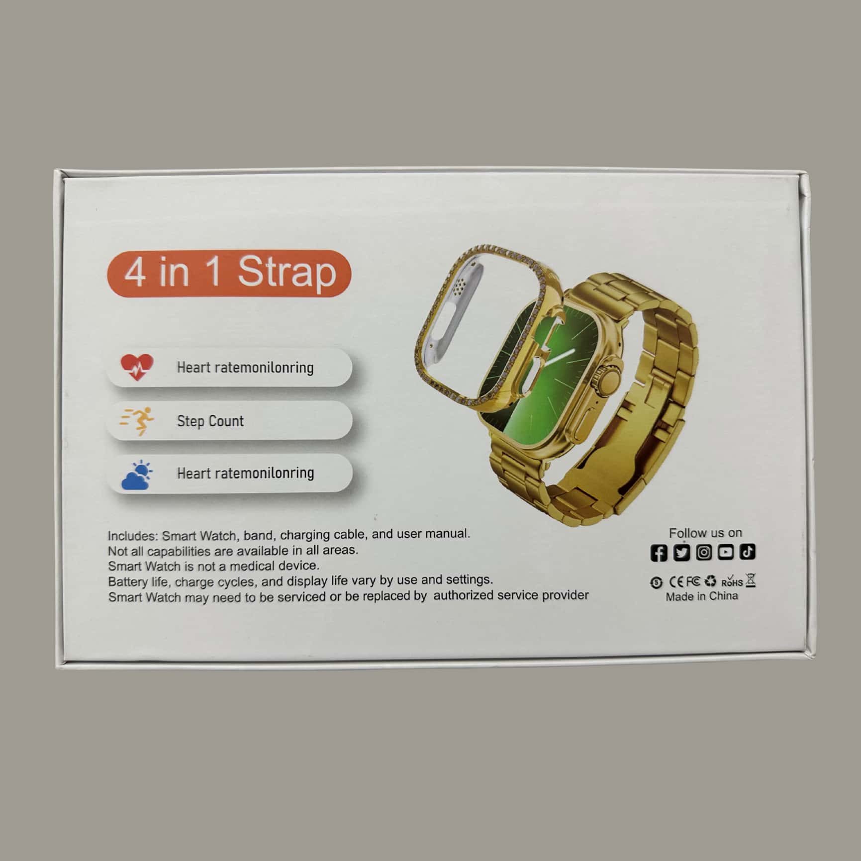 Experience the perfect blend of sports, health, and fashion with this ultra-lightweight smartwatch set. The 4-in-1 combo includes a stylish watch with two straps and a premium chain, making it ideal for every occasion. Stay connected with phone call and message alerts, monitor your heart rate, sleep, blood pressure, and SpO2, and track your workouts with multiple exercise modes. Enjoy extra features like Bluetooth music, camera control, weather updates, and wireless charging — all packed into a sleek, modern design.
